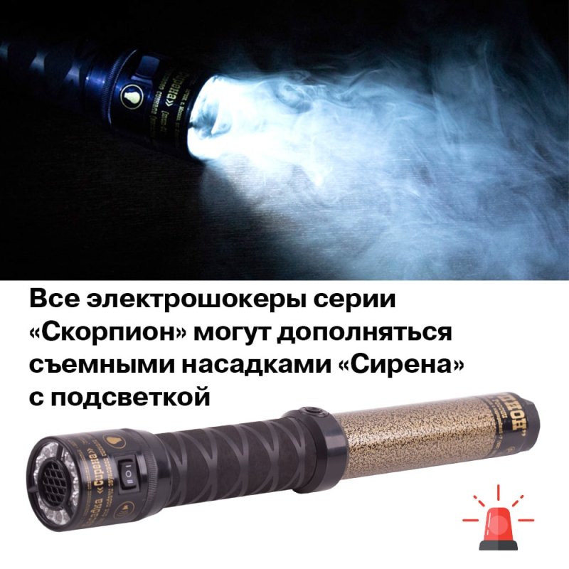 Съемная насадка «Сирена» легко крепится к торцу рукоятки шокера и используется в случае необходимости. «Сирена» генерирует оглушительный звук силой до 120 дБ, дезориентируя нападающего и привлекая внимание окружающих. Кроме того, насадка оборудована светодиодным фонариком для кратковременного освещения.