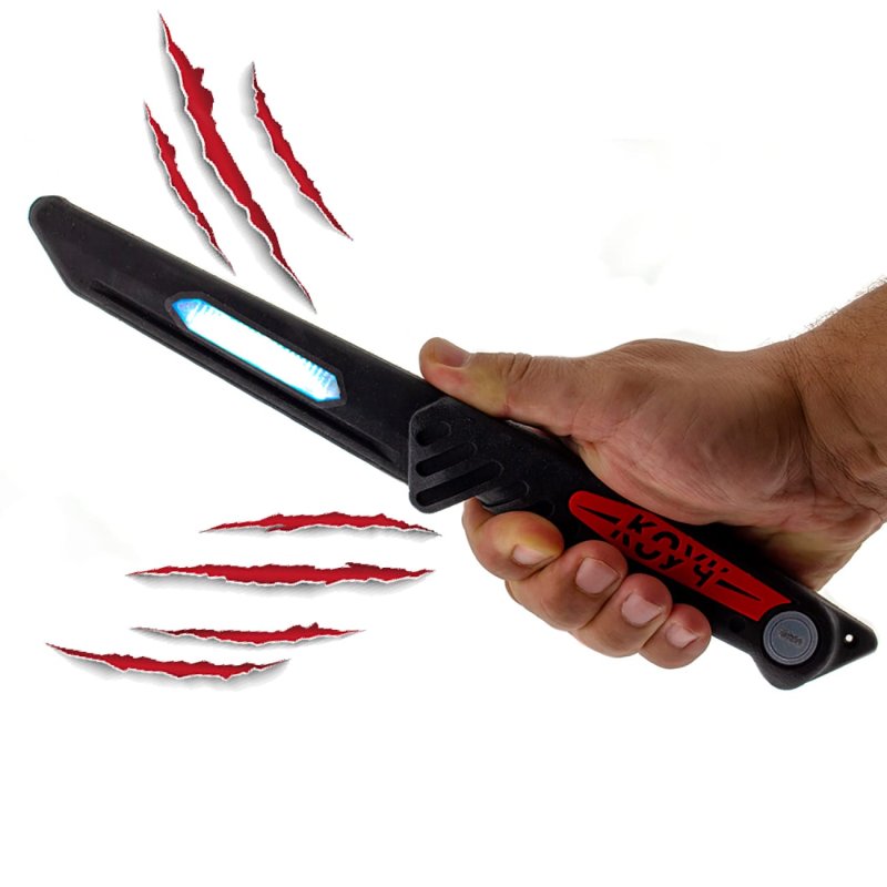 Шоковый нож со световой, звуковой индикацией и имитацией пореза отлично подойдёт как для соревнований, так и для тренировок. Опции ножа будут полезны как бойцу, отрабатывающему приёмы ножевого боя (индикация), так и обороняющемуся (имитация пореза).